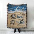 God Is Within Her Sand Beach Sea Turtle Woven Throw Blanket - Christian Woven Blanket Prints - Bible Verse Woven Blanket Art