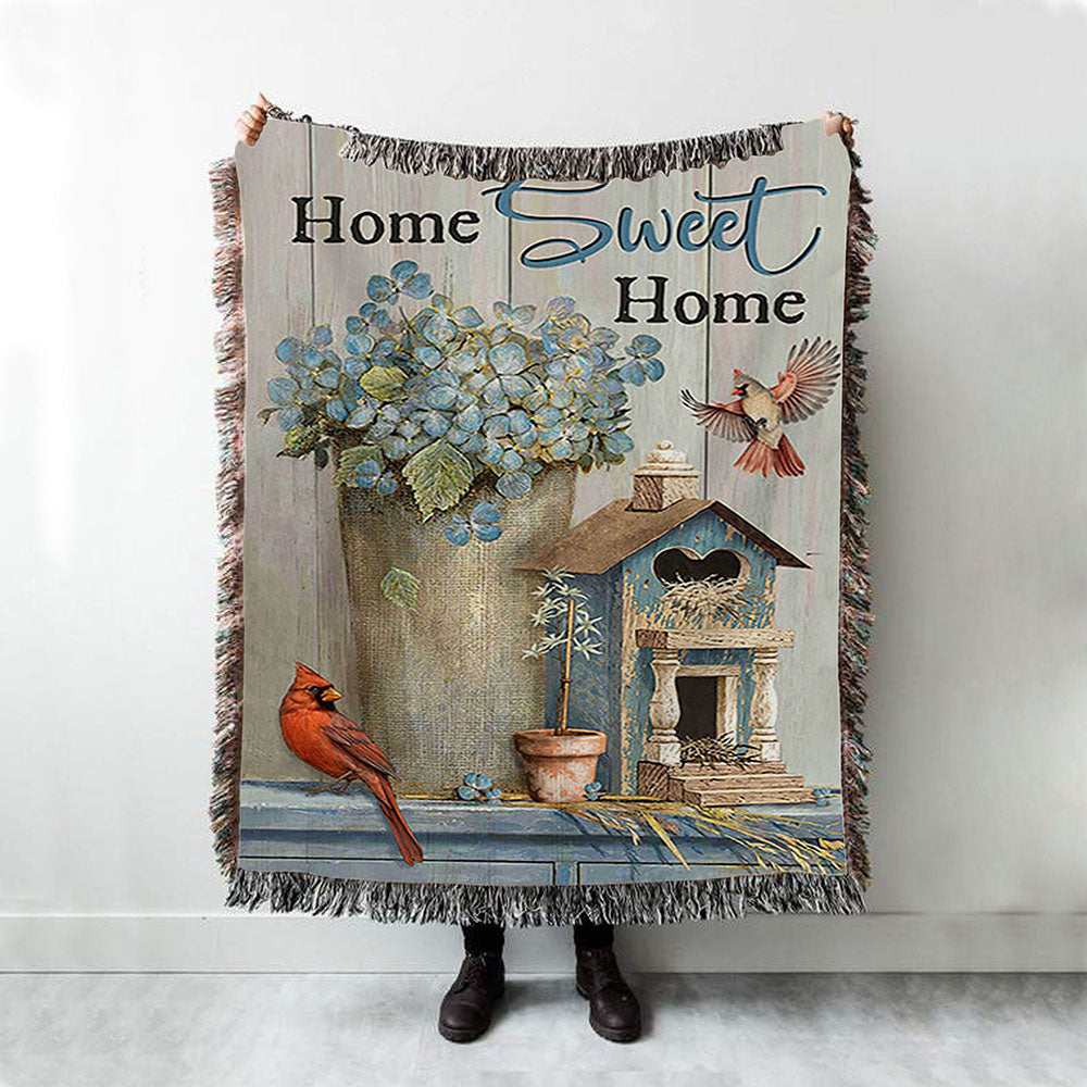 Home Sweet Home Blue Hydrangea Red Cardinals Woven Blanket Art - Bible Verse Throw Blanket - Christian Inspirational Boho Blanket