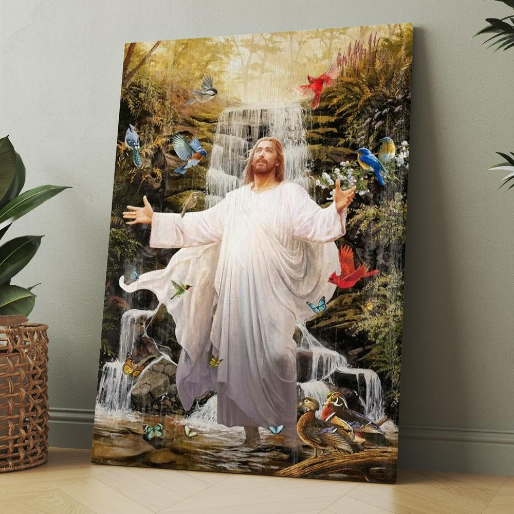 Jesus, Colorful Birds, Forest Stream, Scenery Painting Canvas, Christmas Gift for Christian