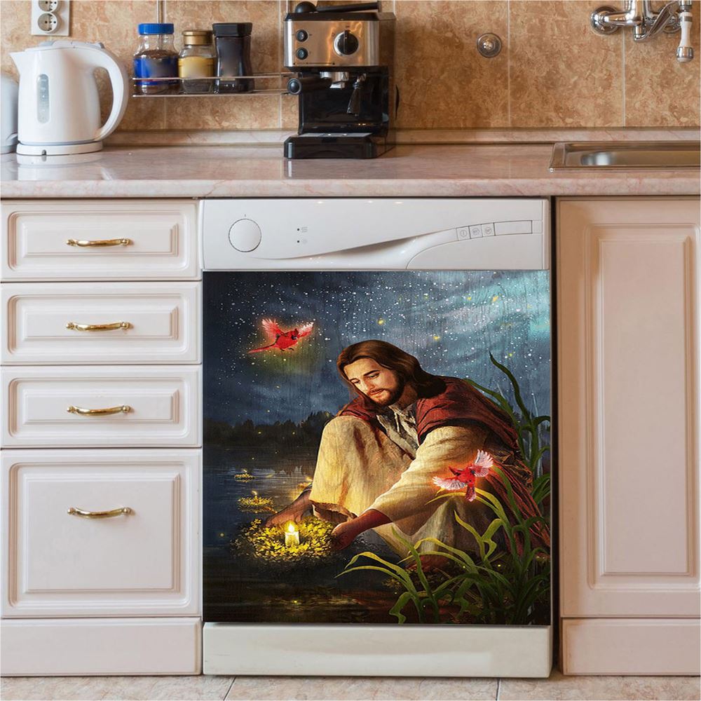 Jesus Painting Red Cardinal Advent Candles Dishwasher Cover, Jesus Portrait Dishwasher Stickers, Christian Kitchen Decor