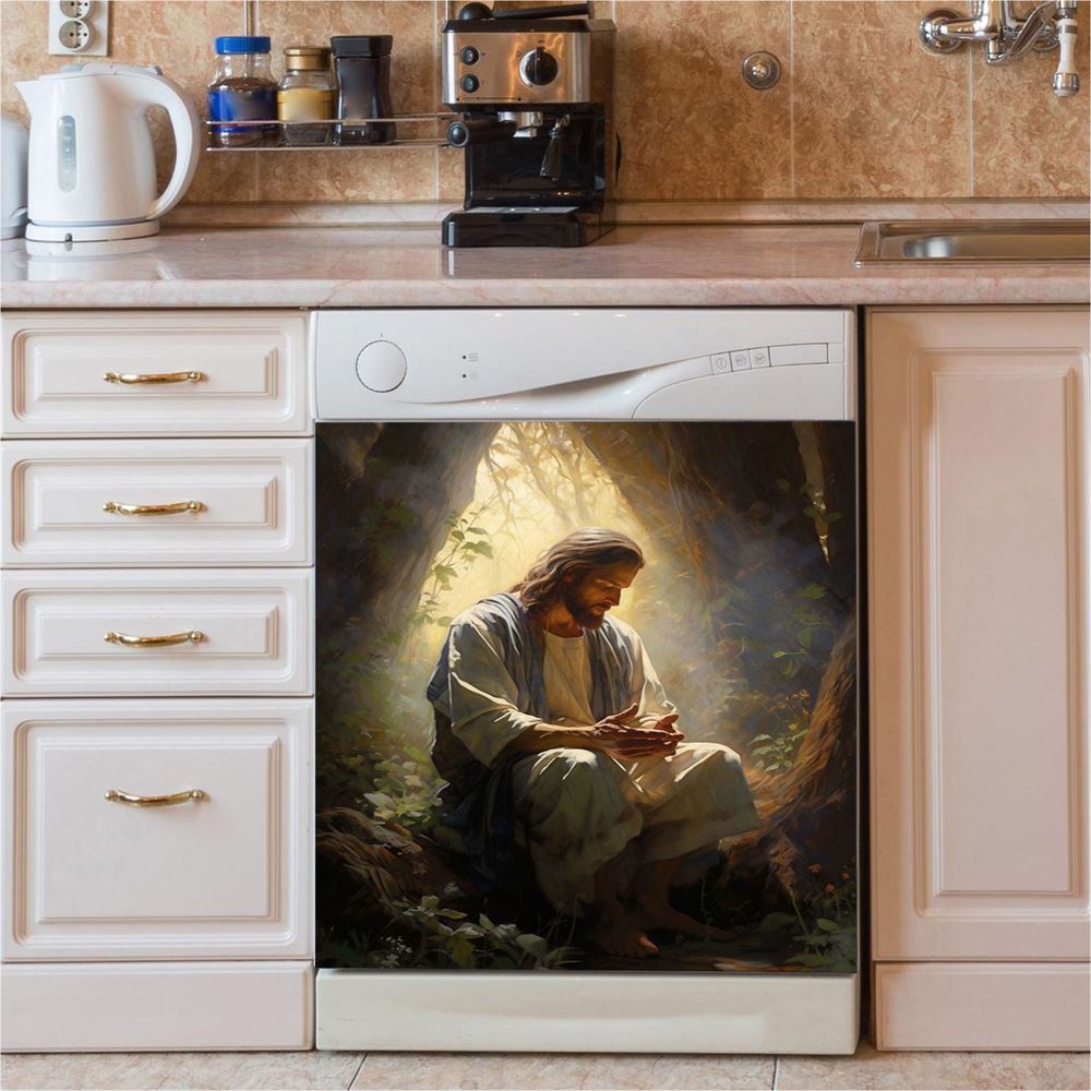 Jesus Praying And Lion Dishwasher Cover, Jesus Portrait Dishwasher Wrap, Christian Kitchen Decoration
