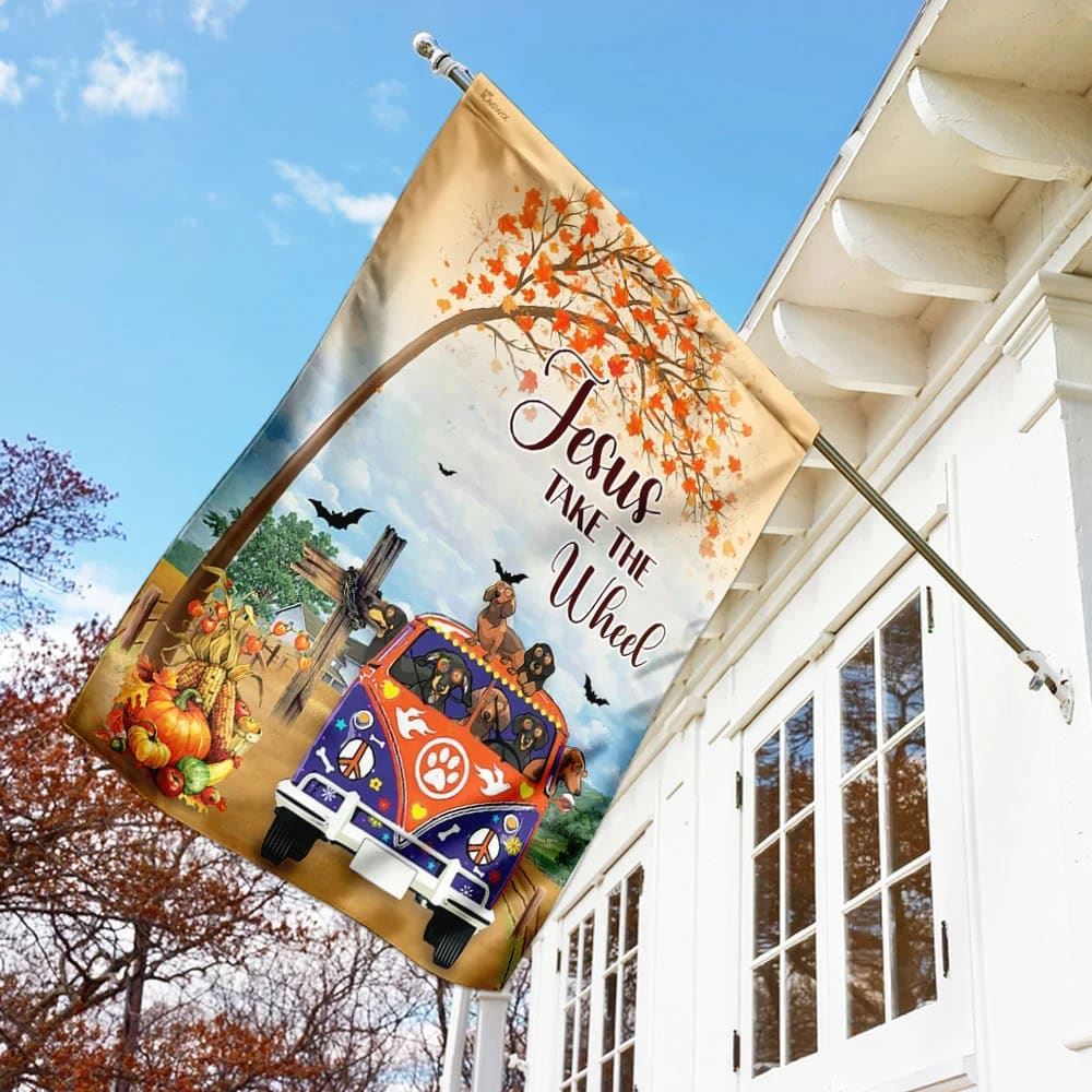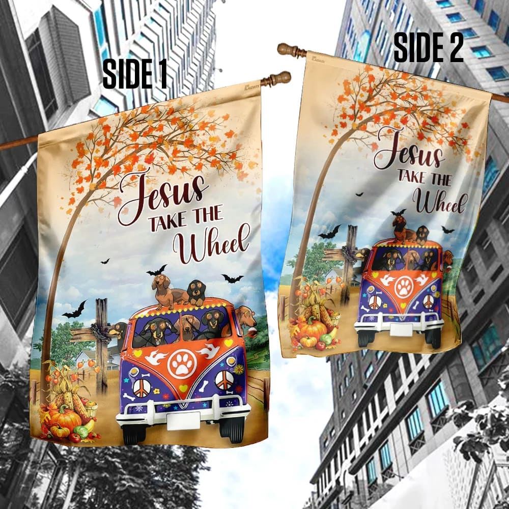 Jesus Take The Wheel Dachshund House Flag, Christian Flag, Christian Flag, Scripture Flag, Garden Banner