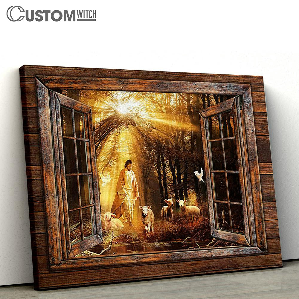 Jesus Walking With Lambs Into The Beautiful Forest Canvas Art - Christian Wall Art Decor - Bible Verse Canvas