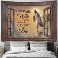 Jesus Walks on beach Tapestry - I will walk by faith Tapestry Wall Art - Bible Verse Tapestry - Religious Tapestry Wall Hanging