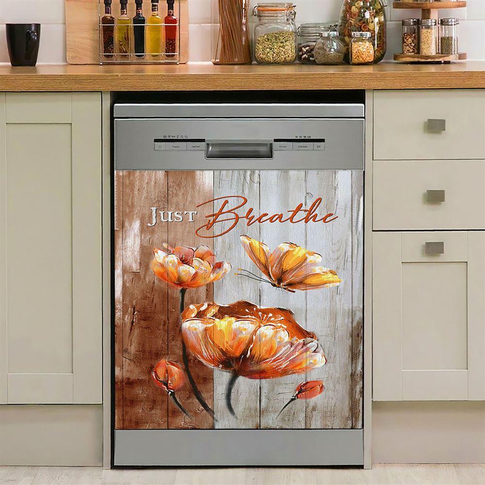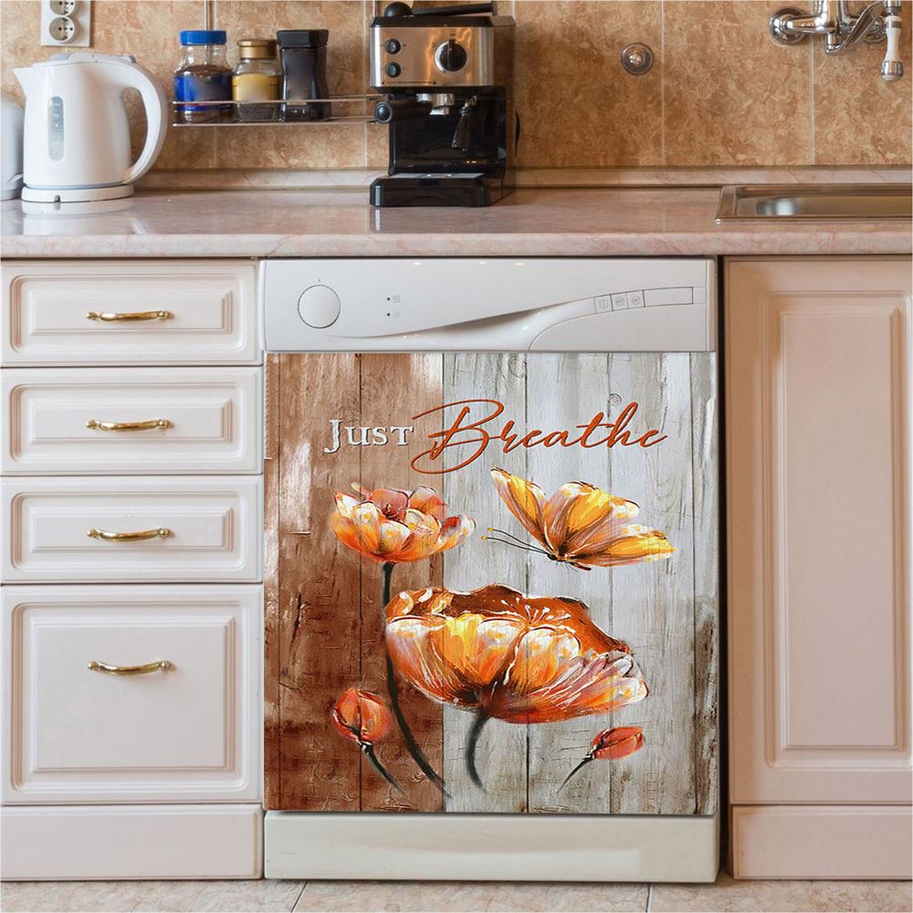 Just Breathe Anemone Flower Butterfly Dishwasher Cover, Christian Dishwasher Wrap, Bible Verse Kitchen Decoration