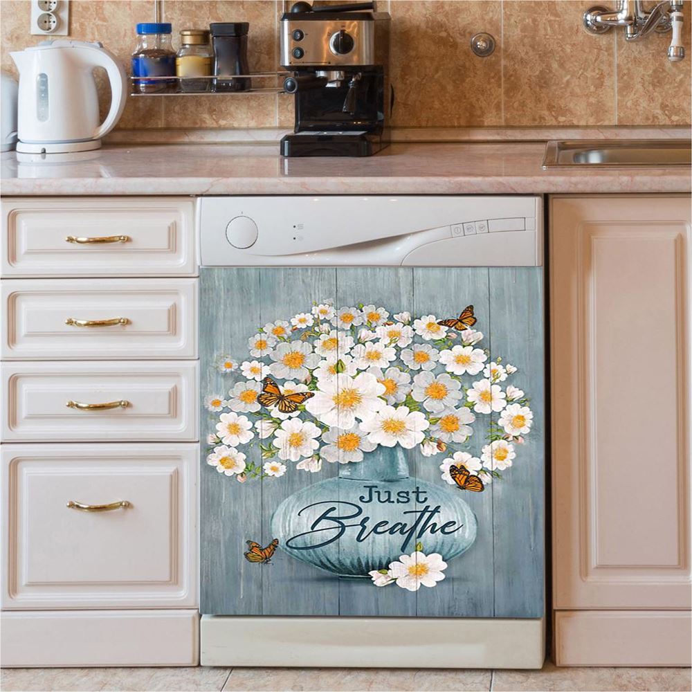 Just Breathe Apricot Blossom Monarch Butterfly Flower Dishwasher Cover, Christian Dishwasher Wrap, Bible Verse Kitchen Decoration
