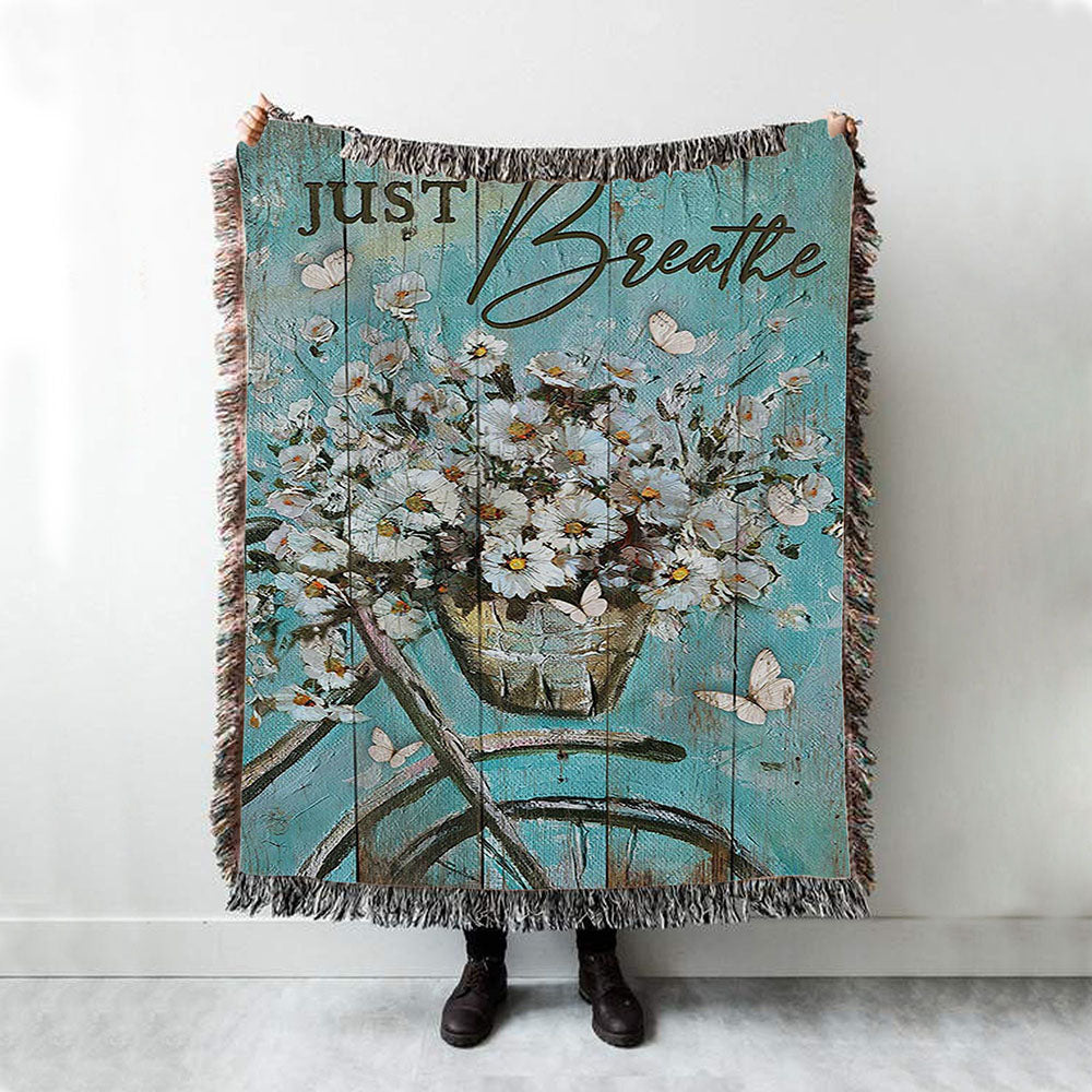 Just Breathe Bicycle Daisy Vase White Butterfly Woven Blanket Art - Christian Art - Bible Verse Throw Blanket - Religious Home Decor