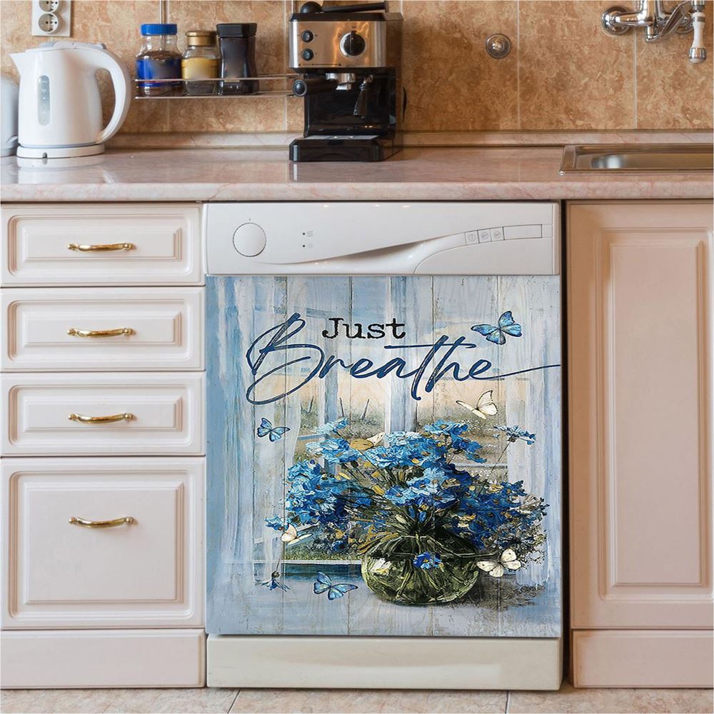 Just Breathe Blue Daisy Butterfly Dishwasher Cover, Christian Dishwasher Wrap, Religious Kitchen Decoration