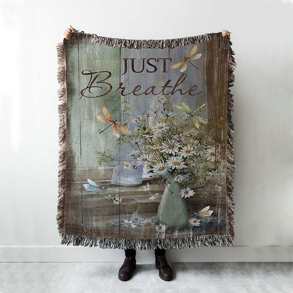 Just Breathe Daisy Flower Dragonfly Woven Blanket Art - Christian Art - Bible Verse Throw Blanket - Religious Home Decor