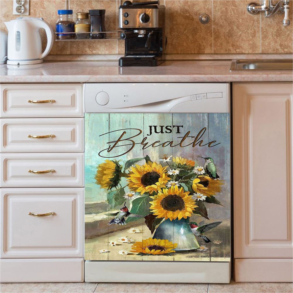 Just Breathe Sunflower Cat Dishwasher Cover, Bible Verse Dishwasher Wrap, Christian Kitchen Decoration