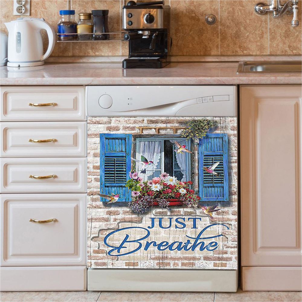 Just Breathe Window Flower Hummingbird Dishwasher Cover, Bible Verse Dishwasher Wrap, Christian Kitchen Decoration