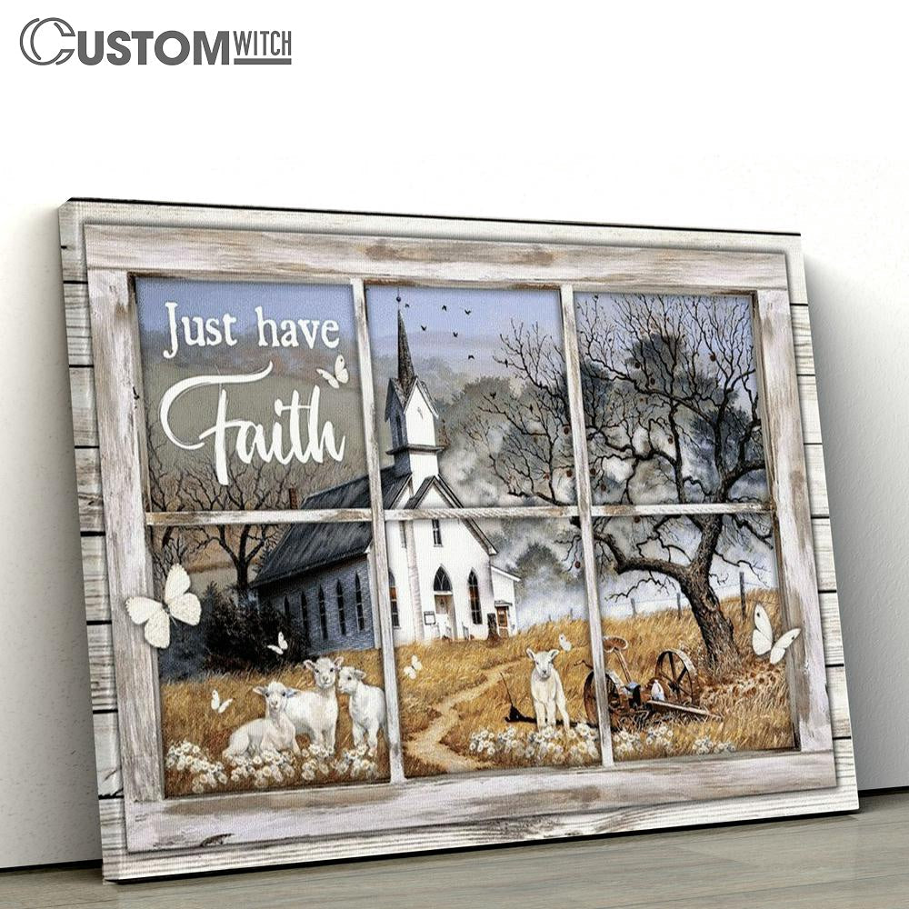 Just Have Faith, White Church, Sheep, Butterfly, Countryside Canvas Poster