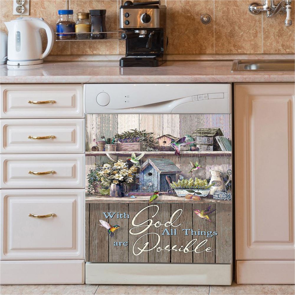 Kitchen Flowers Hummingbird With God All Things Are Possible Dishwasher Cover, Christian Dishwasher Wrap, Bible Verse Kitchen Decoration