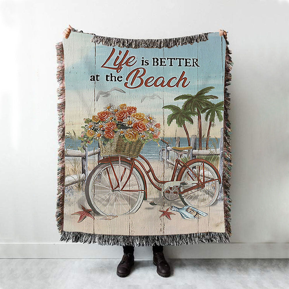 Life Is Better At The Beach Flower Basket Beach Cruiser Woven Blanket - Christian Throw Blanket - Religious Home Decor