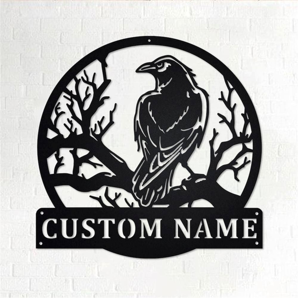 Personalized Metal Monogram Sign, Black Crow Sitting Night On Tree Metal Wall Art, Black Crow Name Sign, Decoration For Room