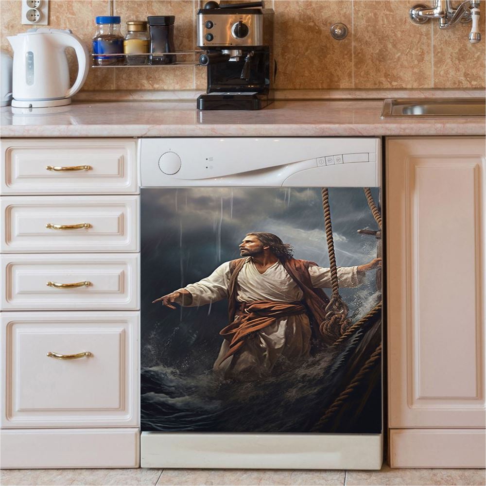 Power Jesus Christ Came To Rescue A Fishing Boat Dishwasher Cover, Jesus Dishwasher Wrap, Christian Kitchen Decoration