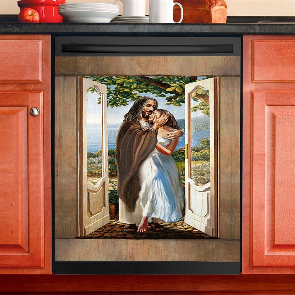 Pretty Girl Beautiful Forest Walking With Jesus Dishwasher Cover, Inspirational Dishwasher Wrap, Christian Kitchen Decoration