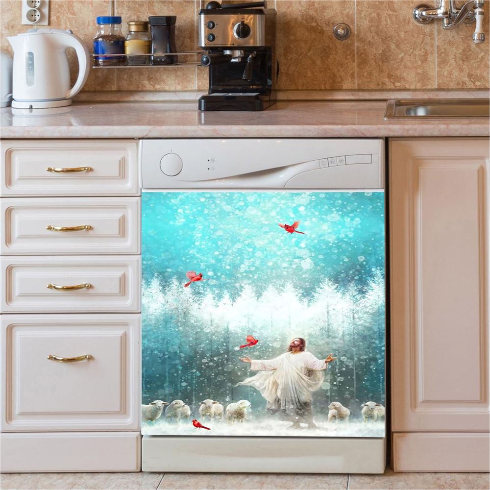 Radiance Jesus And Snow Cardinal Dishwasher Cover, Jesus Christ Dishwasher Wrap, Christian Kitchen Decoration