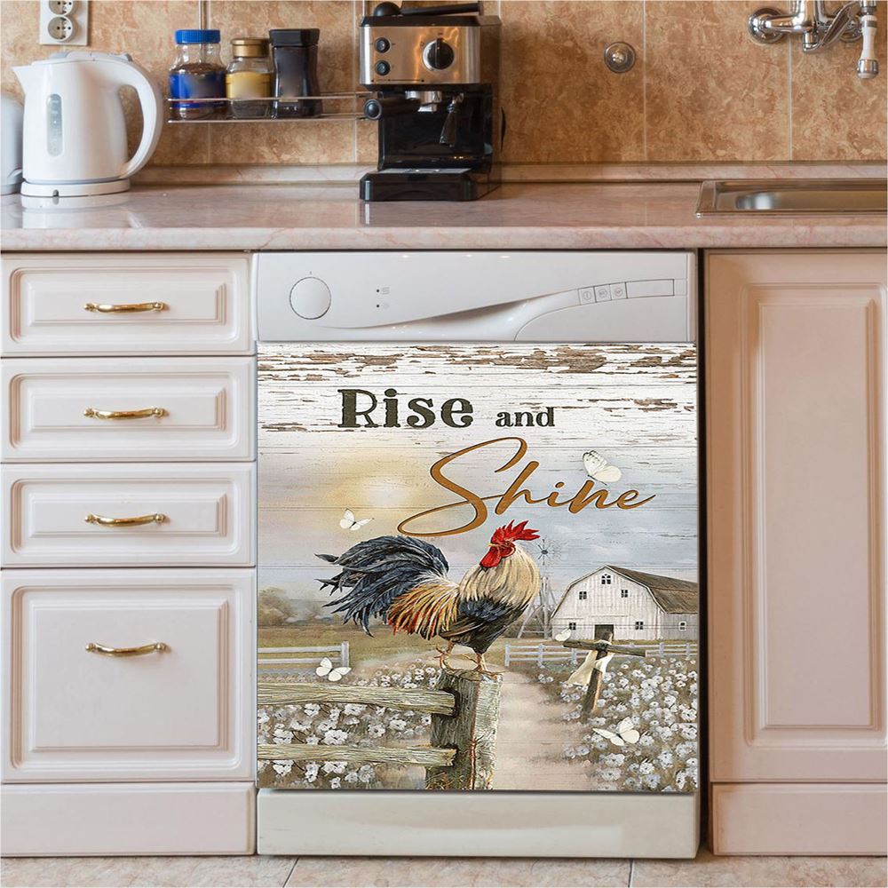 Rooster White Flower Field Sunset Rise And Shine Dishwasher Cover, Christian Dishwasher Wrap, Bible Verse Kitchen Decoration