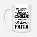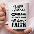 She Doesn'T Beg Force And Chase She Prays Works And Has Faith Coffee Mug, Christian Mug, Bible Mug, Faith Gift, Encouragement Gift