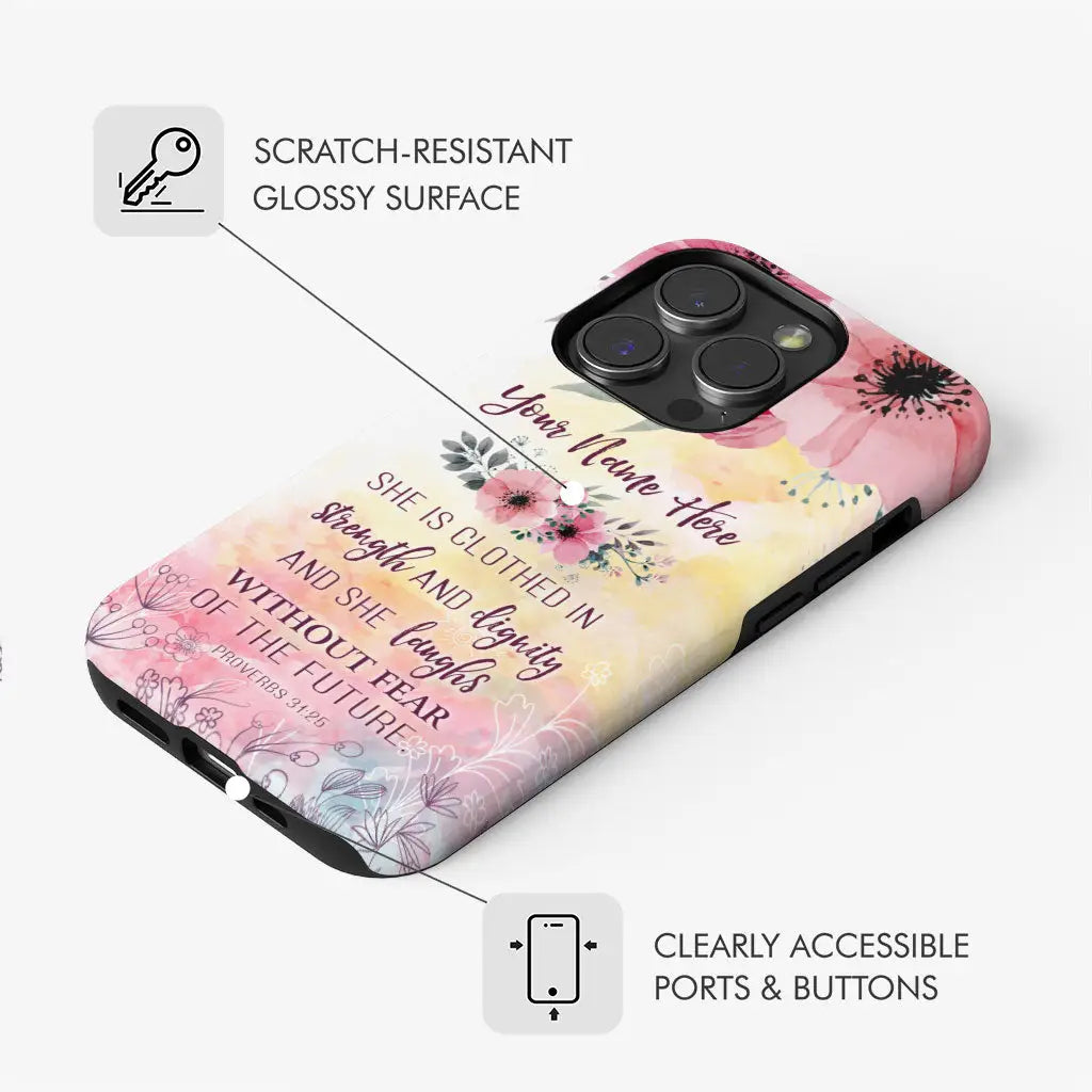 Personalized She is Clothed in Strength and Dignity Proverbs 31:25 Phone Case With Custom Name