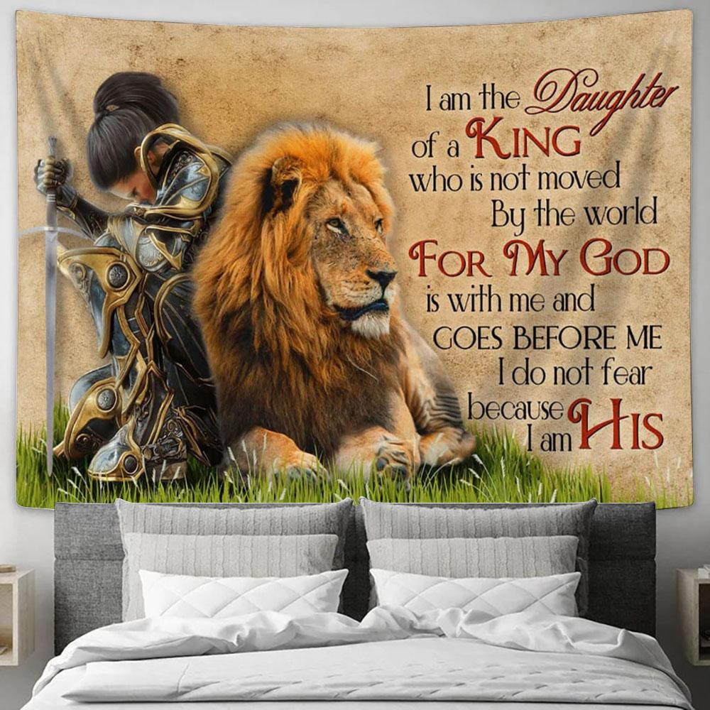 Warrior Woman And Lion I Am The Daughter Of A King Who Is Not Moved By The World Tapestry Art - Scripture Tapestry Prints - Christian Wall Art