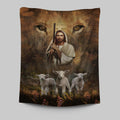 White Lamb Lion's Eyes Walking With Jesus Tapestry Wall Art - Christian Tapestries Prints - Bible Verse Tapestry Art