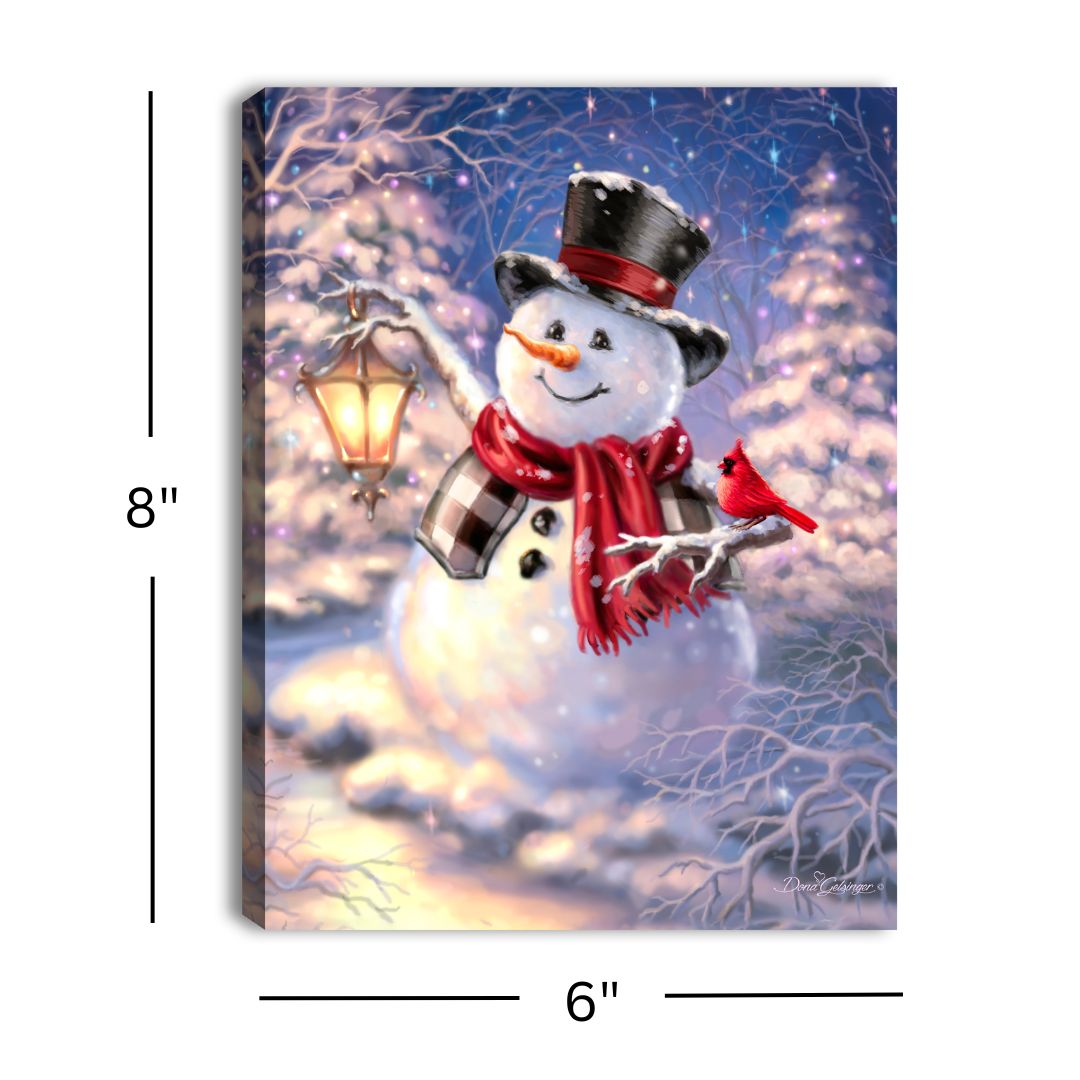 Celebrate the magic of the holiday season with our Home for the Holidays 8x6 Lighted Tabletop Canvas. A charming snowman, dressed in a cozy scarf, top hat, and mittens, greets you with a warm smile as you follow the path to a partially open red door, beckoning you inside. The twinkling lights strung through the trees add a touch of enchantment to the scene, while the colorful lights adorning the pine tree on the other side of the path fill the air with joy and merriment.