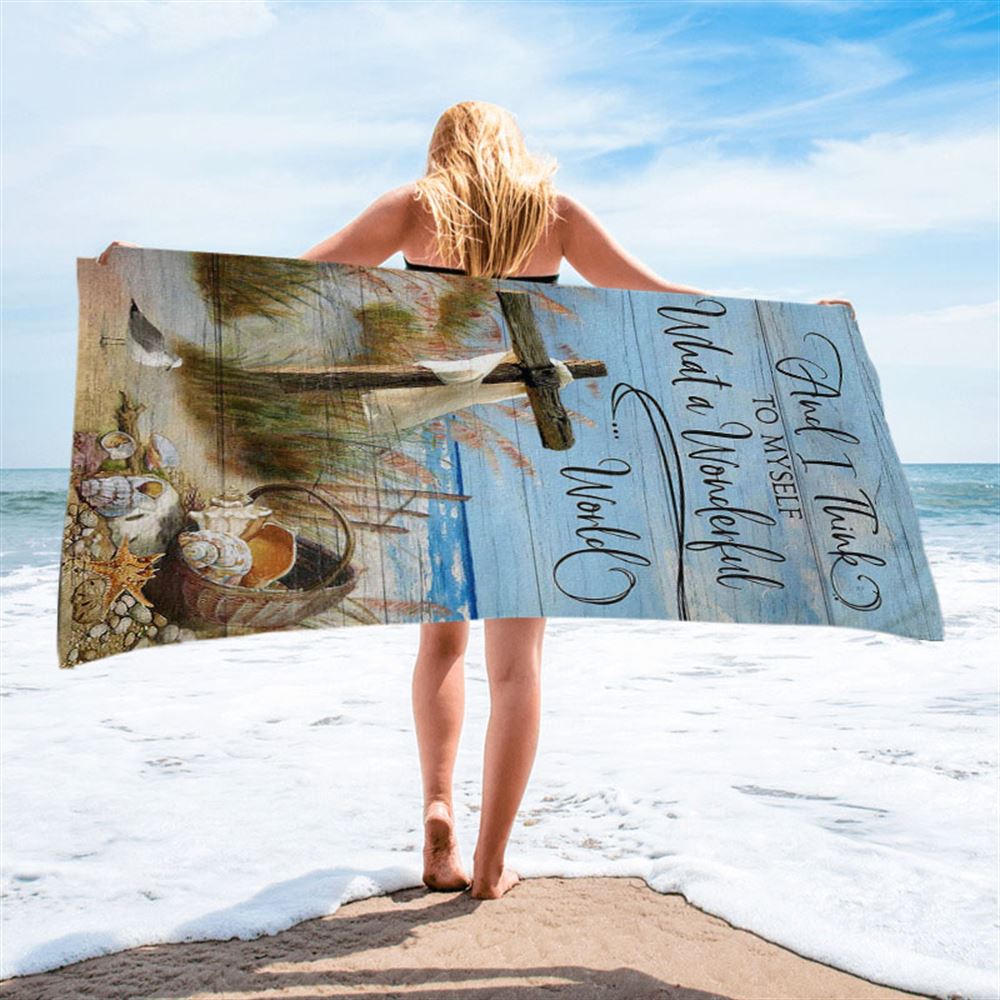 Wooden Cross And I Think To Myself What A Wonderful World Beach Towel - Christian Art - Bible Verse Beach Towel - Religious Beach Towel