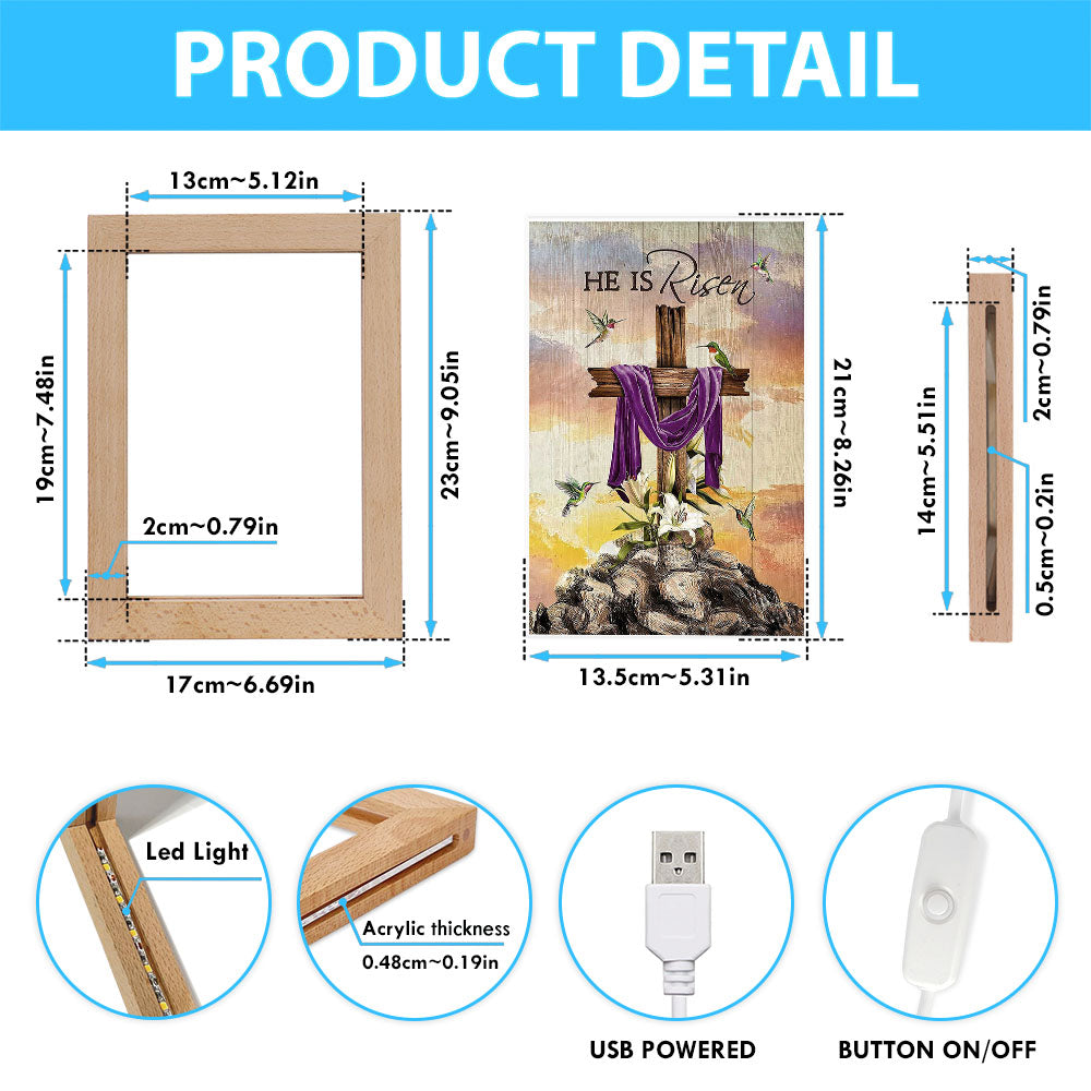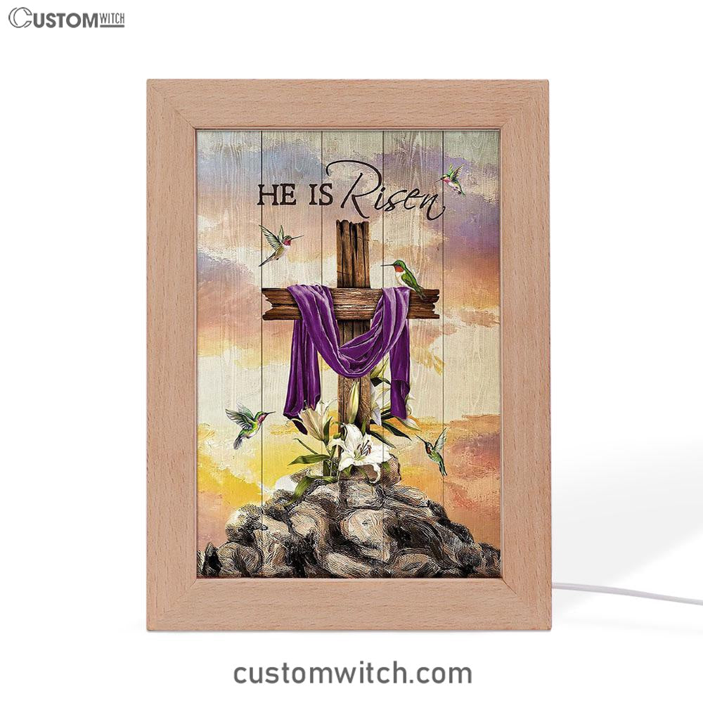 Wooden Cross Lily Flower Hummingbird He Is Risen Frame Lamp Art - Christian Art - Bible Verse Art - Religious Home Decor